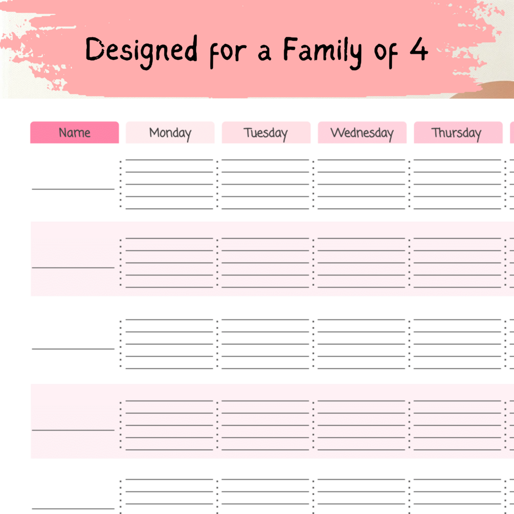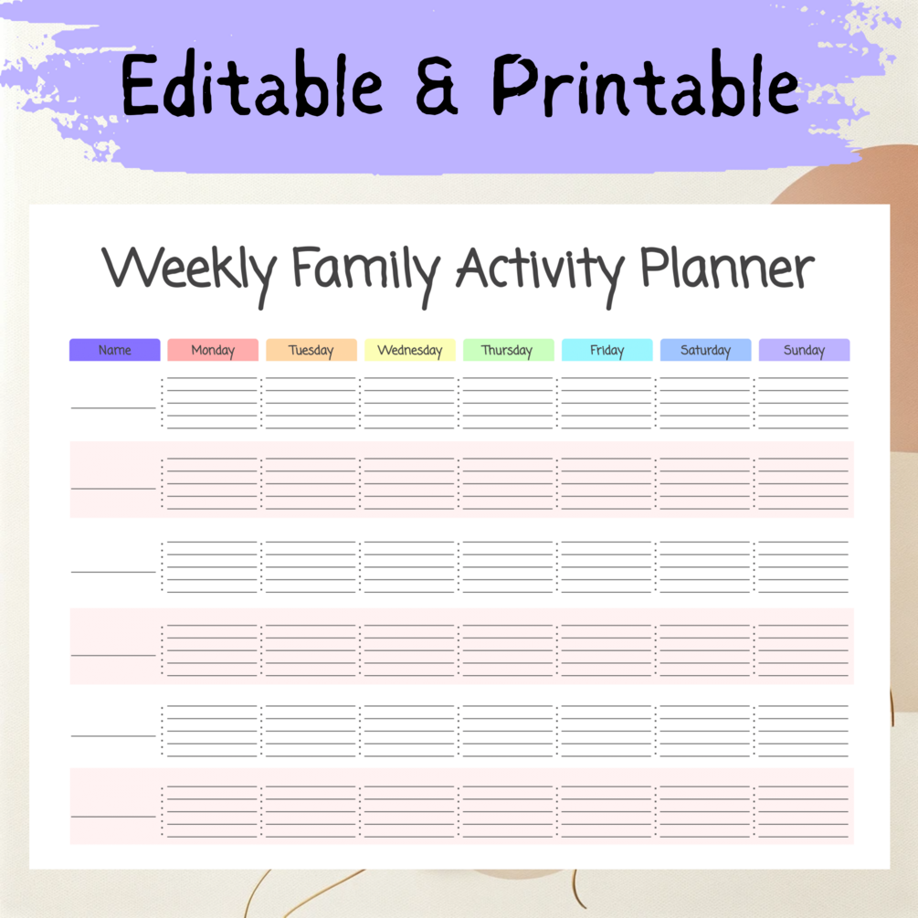 Keep your family's weekly activities organized and visible with our Family Weekly Activity Planner. This printable template provides a clear weekly layout to track appointments, events, and activities for each family member. It's a fantastic tool for busy households, ensuring everyone stays informed and activities are managed efficiently. Ideal for display or personal use, it helps in maintaining a well-organized family schedule.